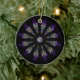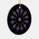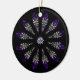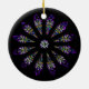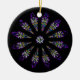 Um adorável padrão de vidro manchado enfeita este ornamento feriado em cores dominantes de roxo, azul, amarelo e preto. Doze penas abstrato circulam uma máscara central para formar uma design de mandala espiritual com uma sensibilidade Nativa Americana. Apropriado para o Natal ou qualquer época do ano.