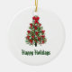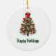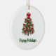 Árvore de Natal elegante com arcos vermelhos e luzes brancas com a rotulação verde escuro que diz "boas festas"