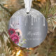 Um ornamento para um aniversário de 50 anos. Um fundo de olhar prateado escuro. Decorado com púrpura escura e flores cor-de-rosa-burro e rosa, brilho fino prateado, aparência de pingar tinta. Modelos para um nome, data e 50 anos. O nome é escrito com um script estilo branco moderno, escrito à mão. Perfeito como decoração de festas de inverno, favor, guardar ou um presente.