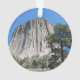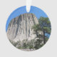 Localizado nas Colinas Negras do nordeste do Wyoming, o Monumento Nacional da Torre de Demônios, tem altura contra o céu azul. Essa foto colorida captura as sombras, formadas pelas colunas verticais de rocha ígnea, destacando os entalhes na face da torre. Pedras soltas formam uma pilha perto da base da torre. Pinheiros circundam a base à medida que ela sobe acima da paisagem ao redor. Um pinheiro Ponderosa fica de pé no primeiro plano, adicionando um contraste verde contra a torre e um céu azul.