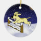 A cena bonito dos desenhos animados tem um desenho de um cão que salta sobre uma cerca coberto de neve, com a neve que cai no fundo do céu nocturno. Enfeites de natal excelentes do cão da agilidade!