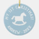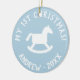 A rua do bebê é um ornamento de cavalo de balanço da árvore de Natal. Coloque sua própria foto no verso, opcionalmente. Design bonitinho com cavalo de brinquedo e tipografia vintage. Mantenha-se divertido para o primeiro Natal de recém-nascidos. Personalize a cor de fundo para cor rosa ou azul para uma nova menina ou rapaz.