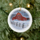 Ornamento da árvore de Natal que caracteriza um celeiro vermelho bonito em uma cena invernal do rancho.