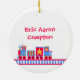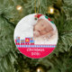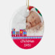 O primeiro ornamento de Natal de um bebê doce feito de uma cerâmica redonda com uma bonito corda de ouro. Gráficos de um trem colorido de brinquedo que bordeja um fundo vermelho, no fundo do ornamento, e uma fotografia personalizada, no topo do ornamento. O texto branco no fundo e no verso é totalmente personalizável. Personalize todo o texto e a foto do seu bebê, para um doce primeiro Natal ou como um presente adorável para os novos pais ou avós.