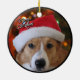 Foto bonito de um Corgi de Galês do Pembroke que veste um chapéu do papai noel, em uns enfeites de natal. Decoração adorável do amante do cão!