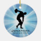 Discus Thrower Personalised Ornament Christmas 20XX. Um jogador de disco se posiciona contra um fundo azul de estouro. Todo texto personalizável, frente e verso!