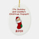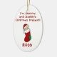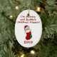 Você pode personalizar a parte traseira e para mudar a data ornamento da lembrança do Natal deste bebê bonito no primeiro que caracteriza um bebê em um texto vermelho do estilo da meia e do miúdo do Natal que me leia "está presente do Natal das mamães e do pai!"