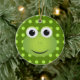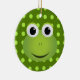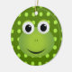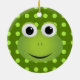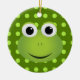 Este ornamento do sapo é perfeito para todo o amante do sapo! Caracteriza um design de um sapo verde bonito dos desenhos animados com um sorriso grande. O sapo está em um fundo verde escuro com luz - bolinhas verdes.