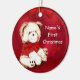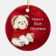 Um ursinho bonitinho em um Enfeites de natal. O ornamento tem o texto personalizável "Nome do Primeiro Natal" e modelos para sua personalização.