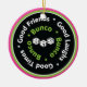 Este design gráfico colorido é imprimido em ambos os lados do ornamento. Diz o "bom amigo, bons risos, boas épocas, Bunco. Featured é três dados de Bunco. Este ornamento faz um grande presente para o aniversário, os feriados, a hospedeira e o mais. Isto igualmente seria grande como um prêmio de Bunco. Podia igualmente ser usado como uma decoração para seu evento seguinte de Bunco.