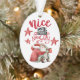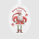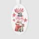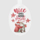 A frente deste ornamento declara "Nice Até o Malvado Comprovado" em texto vermelho e preto estilizado. Abaixo, o texto senta uma sábia Cláusula Santa em um casaco vermelho e leggings listradas verdes, segurando uma xícara de sua bebida favorita. Ao lado do texto estão as estrelas vermelhas. A parte de trás do ornamento tem seu texto personalizado em dois campos, e outra imagem do Pai Natal. Única e fofa!