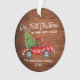 Escrita de Pincel Moderna Nosso Primeiro Natal em nosso Novo Ornamento Doméstico inclui Caminhão Vermelho Vintage com Água com Árvore de Natal. Madeira Rústica Do País.