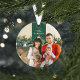 Personalize este elegante ornamento redondo com uma foto em cada lado para comemorar um ano especial. Personalize a frente com seu nome de família em branco em uma faixa verde de fita esfestiva e adicione o ano às costas.