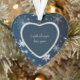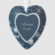 Imaginem a sua surpresa e prazer quando ela abrir o pacote contendo este belo ornamento personalizado da proposta de casamento! Ele apresenta seu texto personalizado sobre um fundo azul escuro dentro de um quadro em forma de coração brilhante faux jewel. O quadro é colocado sobre um fundo de flocos de neve prateados sobre um fundo azul-céu noturno. O outro lado do ornamento tem o mesmo fundo do floco de neve, estrutura cardíaca e mais texto para você personalizar. *Observe que a imagem está impressa e não contém joias ou metal.*