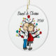 Um ornamento cerâmico redondo bonito do feriado do Natal da lembrança caracteriza uma figura casal expectante da vara na frente de uma árvore de Natal decorada com áreas que você pode personalizar com nomes e o ano em curso! Este ornamento bonito da lembrança do feriado faz um grande presente para que a mamã e o pai deva comemorar um ano especial!