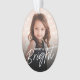 Este ornamento de na moda fotográfico apresenta uma tipografia moderna e um padrão divertido no verso, composto por ornamentos coloridos e flocos de neve.