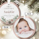 First Christmas as Auntie Personalized with Baby's Name, Birthdate, and Photo Round Acrylic Keepsake Ornament... A delicate bouquet of pink roses, pine cones, and holiday season botanicals decorates the rose gold metallic frame circling the text on front of your Christmas ornament gift for family members. On back of the ornament is the grandchild's photo also framed by metallic rose gold. The example wording on this keepsake ornament reads "First Christmas as Auntie of Bethany Westfield 05.15.2025". All example text and the placeholder photo can be easily revised with your own on the personalization template.