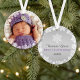 O Elegante floco de neve emoldurado pela primeira design de decoração de fotos de Natal do bebê apresenta uma coroa redonda de flocos de neve brancos no inverno que enquadra a foto de recém-nascido da menina. Uma mensagem personalizada de "Primeiro Natal do Bebê" aparece no verso com texto que pode ser personalizado com o nome do bebê e o ano de nascimento. A cinza de prata e o esquema de cor violeta roxa podem ser alterados para corresponder à sua foto!