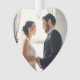 Elegante adorno de guardas de férias em forma de coração para um novo casal apresenta um retrato de casamento na frente com um monograma personalizado e "Primeiro Natal como Sr. & Sra." no verso. As cores branco, rosa e dourado no verso podem ser personalizadas.