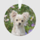 Um branco de creme de cabelos compridos novo coloriu o cão que senta-se em um jardim de florescência, foto da chihuahua tomada por Katho Menden. Este ornamento acrílico do xmas do círculo é uma ideia do presente para amantes do cão. http://www.zazzle.com/kathom_photo