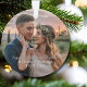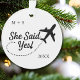 Celebre o amor em novas alturas com este enfeite de Natal com tema de viagem para noivado! Na frente, um rastro de avião caprichoso escreve “Ela disse sim!” com detalhes personalizáveis para as iniciais do casal e o ano. Vire-o para personalizar ainda mais, envie sua própria foto e altere o texto padrão “Noiva - Aventura à Espera!”, nomes do casal e a data do casamento.