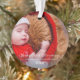 O Primeiro Ornamento de Fotos de Natal do Script de Natal do Bebê. Simples e moderno ornamento fotográfico para o primeiro Natal do bebê. O ornamento tem uma foto de cheio e um roteiro branco sobrepõe a foto. Personalize com a foto do seu bebê e o ano de nascimento. Na parte de trás está o nome do bebê na escrita moderna.