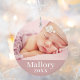 O ornamento de fotos simplesmente elegante para o Primeiro Natal de um bebê pode ser personalizado com uma fotografia de um recém-nascido e um texto personalizado para o primeiro nome. Escolha incluir a mesma foto em ambos os lados ou duas fotos diferentes. A cor de fundo rosa rosa poeirenta pode ser alterada para corresponder às suas fotos!