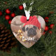 Personalize este adorável ornamento em forma de coração com duas fotos preciosas do seu amigo peludo. Suas legendas personalizadas aparecem na frente e no verso em tipografia de pincel com letra branca. Mostrado com o nome do animal de estimação e o ano.