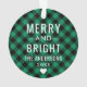 O design de ornamento de fotos para os feriados apresenta sua imagem favorita com o texto do ano em branco (pode ser personalizado) com o padrão de xadrez verde esmeralda e búfalo preto no verso. Personalize o nome personalizado do monograma "Feliz e Brilho" e o texto do ano no verso ou remova. Dica da foto: recorte a foto no formato quadrado antes de carregá-la no modelo de design.