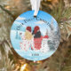 Celebre seu primeiro Natal junto com esta ilustração divertida de um casal louro e penteado escuro de lésbicas caucasianas sentado com as costas para você enquadrado por uma bonito cena da floresta maravilhosa do inverno que tem árvores de abeto e neve carregadas e um bonitinho bonitinho vestindo um chapéu de Papai Noel nele. Eles estão vestindo suéteres de Natal feios e chapéus de Papai Noel vermelho e branco. As palavras, nosso primeiro Natal seguido do ano, aparecem na frente e atrás e há um modelo de foto para você personalizar