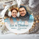 Celebre o seu primeiro Natal junto com este ornamento personalizado de keepsasasaame. O texto da turquesa diz "Nosso Natal das 1ruas" em roteiro de escrita manual com na moda retro. Substitua a imagem de exemplo por sua foto favorita e adicione seus nomes e o ano. Um filtro de gradiente branco ajuda a fazer o pop de texto.