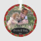 Enfeite de árvore de Natal de dezembro fofo com espaço para personalizar ou customizar com o nome da sua família em uma fonte elegante, foto pessoal e data do ano à sua escolha. Com um lindo e elegante padrão de folhas de azevinho verde e frutas vermelhas como decoração. Lembrança única de memórias que seus filhos, avós, outros familiares ou amigos vão amar!