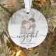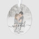 Comemore o seu noivado com este belo ornamento moderno do keepsasaame. O texto negro diz "Nosso primeiro Natal engajado", com a palavra "engajado" em uma escrita elegante com elogios antes e depois. Substitua a imagem de exemplo por sua foto favorita e adicione seus nomes e o ano. Um filtro de gradiente branco ajuda a fazer o pop de texto.