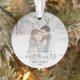 Comemore o primeiro Natal do seu casamento com este belo ornamento moderno do keepsasasaame. O texto verde do pinheiro escuro diz "Nosso primeiro Natal como Sr. & Sra.", com as palavras "Sr. & Sra." em um roteiro elegante com flores antes e depois. Substitua a imagem de exemplo por sua foto favorita e adicione seu sobrenome e o ano. Um filtro de gradiente branco ajuda a fazer o pop de texto.