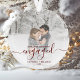 Comemore o seu noivado com este belo ornamento moderno do keepsasaame. O texto vermelho escuro diz "Nosso primeiro Natal engajado", com a palavra "engajado" em uma escrita elegante com florescimento antes e depois. Substitua a imagem de exemplo por sua foto favorita e adicione seus nomes e o ano. Um filtro de gradiente branco ajuda a fazer o pop de texto.