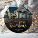 Comemore o seu primeiro Natal em sua nova casa com este lindo ornamento moderno de keepape. O texto diz "Primeiro Natal em nossa nova casa", com as palavras "nova casa" em elegante manuscrito em folha de papel falso em ouro. Substitua a imagem de exemplo por uma foto da sua nova casa e adicione o sobrenome da sua família em fontes brancas sans serif. Um filtro de gradiente escuro ajuda a tornar o texto pop.