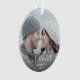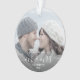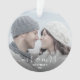 Comemore o primeiro Natal do seu casamento com este belo ornamento moderno do keepsasasaame. O texto branco lê "Nosso primeiro Natal como Sr. & Sra.", com as palavras "Sr. & Sra." em um roteiro elegante, com flores antes e depois. Substitua a imagem de exemplo por sua foto favorita e adicione seu sobrenome e o ano. Um filtro de gradiente escuro ajuda a tornar o texto pop.