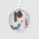 Celebre seu primeiro Natal junto com esta ilustração adorável de um afro-americano de cabelos escuros e uma mulher caucasiana morena sentada de costas para você vestindo suéteres feios de Natal. O adorável gato deles também está vestindo uma camisola e uma senhora tem a mão em volta do seu vagabundo. As palavras, nosso primeiro Natal seguido do ano, aparecem na frente e o verso tem um modelo de foto para você personalizar.