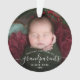 Help them celebrate their first grandchild with this beautiful modern keepsake ornament. The white text reads "Our first Christmas as grandparents," with the word "grandparents" in elegant handwriting script with flourishes before and after. Easily replace the sample image with your favorite photo of the new baby, and add his or her name and the year.