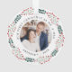 Enfeites de natal festivo, elegante e recém-casado, com 2 das suas fotos favoritas de casamento cercadas por uma coroa de groselhas, eucalipto verde e flores brancas com fundo branco. "Nosso Primeiro Natal como Sr. & Sra." em texto preto na frente e atrás. Personalize o ornamento adicionando suas fotos, sobrenome e o ano. Presente perfeito para casais recém-casados!