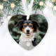 O Enfeites de natal comemorativo personalizado em forma de coração apresenta uma foto do seu melhor amigo peludo com um simples e moderno nome monograma e sotaque de pata em branco. Personalize o design para seu novo filhote, o cachorro de sua família, ou na memória amorosa de um animal de estimação especial.