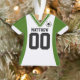 Personalize este adorno de camisa verde e branca de futebol, mudando o nome e o número. O presente perfeito para qualquer fã ou jogador de futebol.