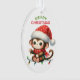 Este é um Enfeites de natal bonito para pais ou avós darem a um filho. A frente do ornamento tem uma imagem de um macaco engraçado vestindo um chapéu e cachecol de Santa Floco de neve. Ele subiu numa série de luzes coloridas de Feriado. O texto verde e vermelho diz "MERRY CHRISTMAS". A parte de trás do ornamento tem seu texto personalizado que é separado por uma pequena cana doce e buquê holly. Mude o texto facilmente para o que quiser!