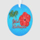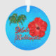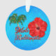 Mele Kalikimaka é havaiano para o Feliz Natal. Comemore um Natal morno agradável da praia. Mele Kalikimaka decorado com enfeites de natal e bastões de doces. Um Natal decorou a palmeira e um hibiscus vermelho do feriado floresce.