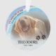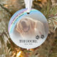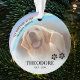Enfeite de Natal memorial de animal de estimação com uma ponte arco-íris colorida no céu celestial, uma foto desbotada do animal de estimação que você está lembrando, a citação de condolências "Eu vou te encontrar na ponte arco-íris", o nome do cachorro/gato, impressões de patas e datas. Esta decoração de árvore de Natal para animais de estimação é fácil de personalizar e é o presente perfeito para você, sua família ou amigos para homenagear aqueles animais de estimação especiais que não estão mais conosco.