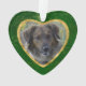Este lindo ornamento memorial de animais de estimação mostra sua fotografia dentro de um quadro brilhante em forma de coração dourado. O quadro é colocado sobre um fundo de flocos de neve de ouro bonito em verde Feriado. A parte de trás do ornamento tem o mesmo fundo dourado em floco de neve com seu texto personalizado em ouro em um coração verde sólido.