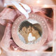 Um belo e mágico noivado guarda o ornamento de fotos para comemorar seu primeiro Natal noivo. O design apresenta um fundo falsa rosa de ouro "Nosso Primeiro Natal" arquivado em torno do ornamento. "Engaged" é exibido em um roteiro elegante. Personalize com duas fotos, uma na frente e outra na parte traseira.