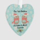 Este Enfeites de natal de acrílico em forma de coração giro pode ser personalizado com nomes na frente e uma data ou outro texto no verso. Projetado com duas corujas em lenços festivos de inverno em um floco de neve com padrão de fundo e sotaque de pínus. Presente de Excelente para um novo casal no primeiro Natal.