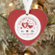 Comemore um belo marco com o nosso Ornamentro de Cerâmica Personalizado "Nosso Primeiro Dia dos Namorados". Este elegante ornamento redondo apresenta um charmoso design vermelho e branco centralizado em torno de dois corações encantadores - um vestido com um smoking formal e o outro com um vestido gracioso.