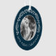 Mínimo e elegante ornamento de Primeiro Natal personalizado com belas coroa branca e azul de Natal. Personalize o produto com o ano, o nome da família e duas das suas fotos favoritas de casamento. Os filtros preto e branco são aplicados automaticamente para uma aparência de vintage.